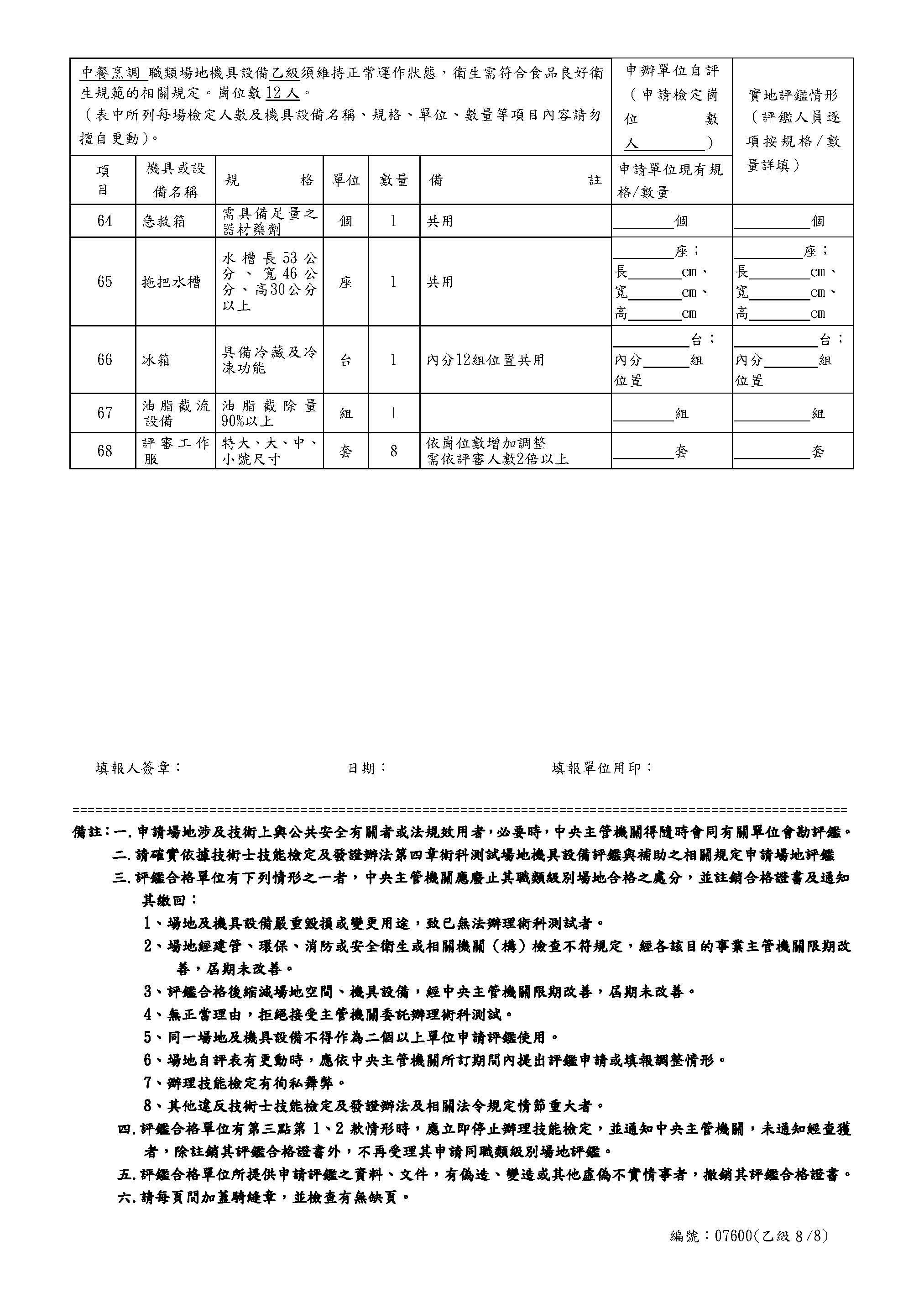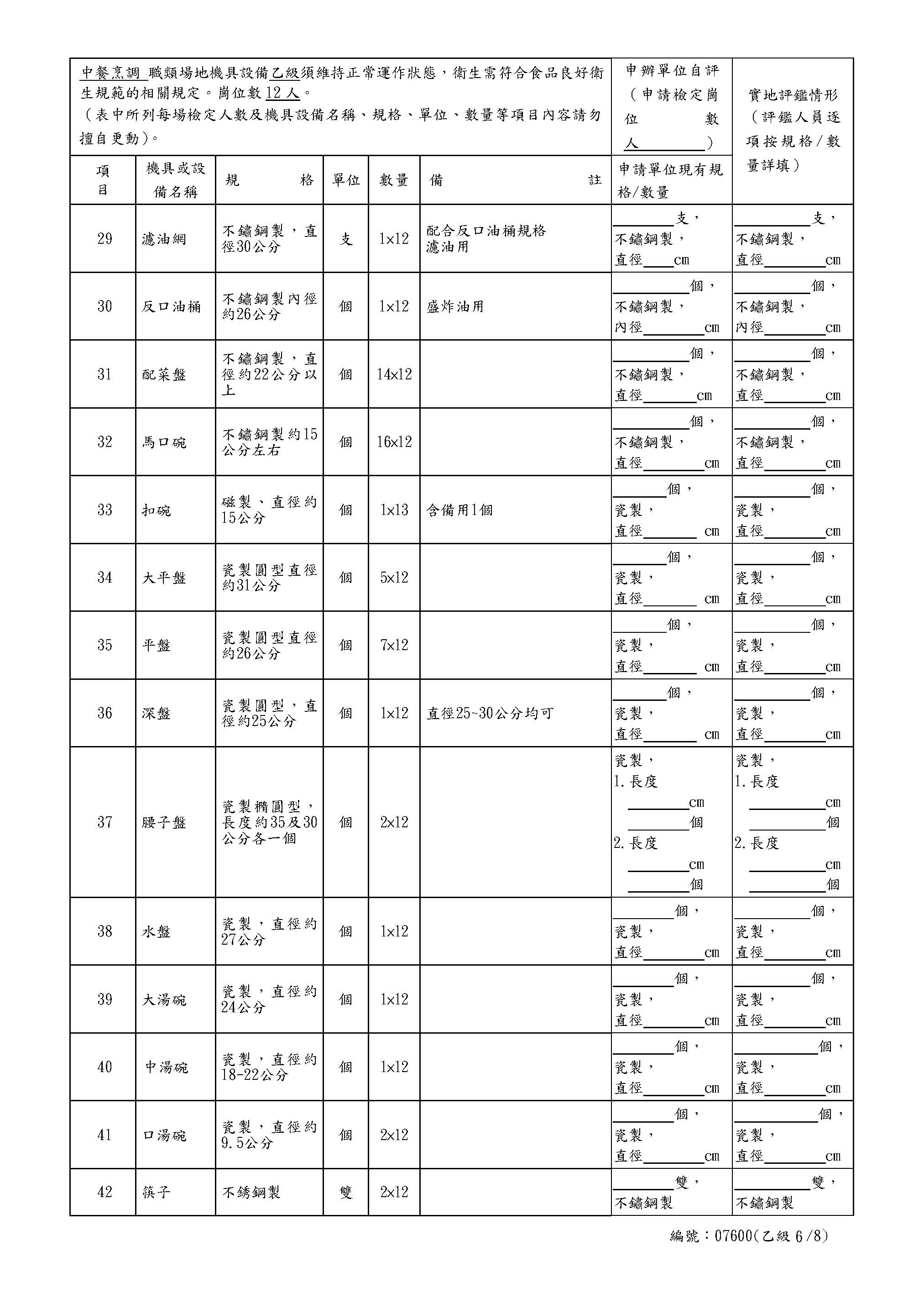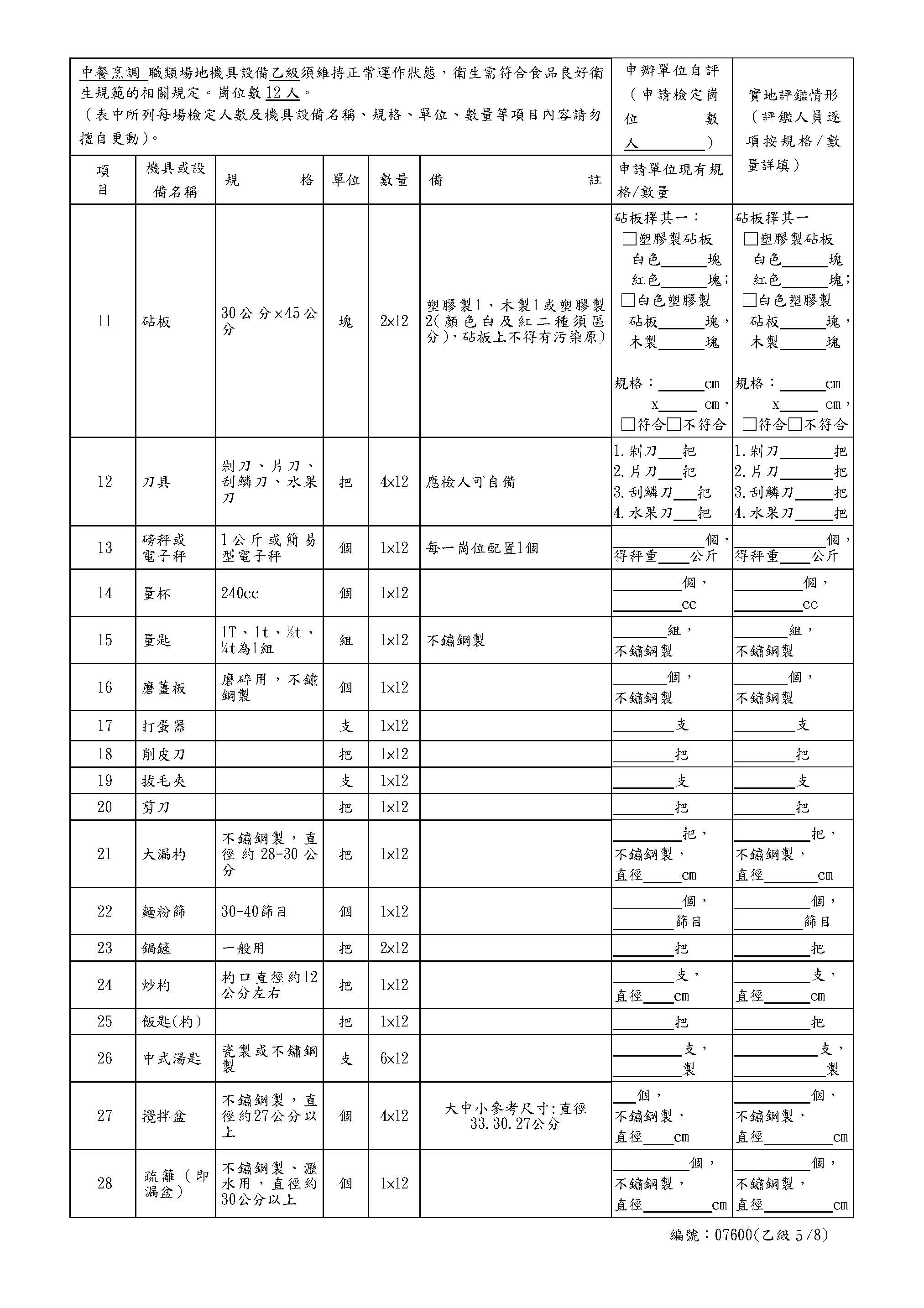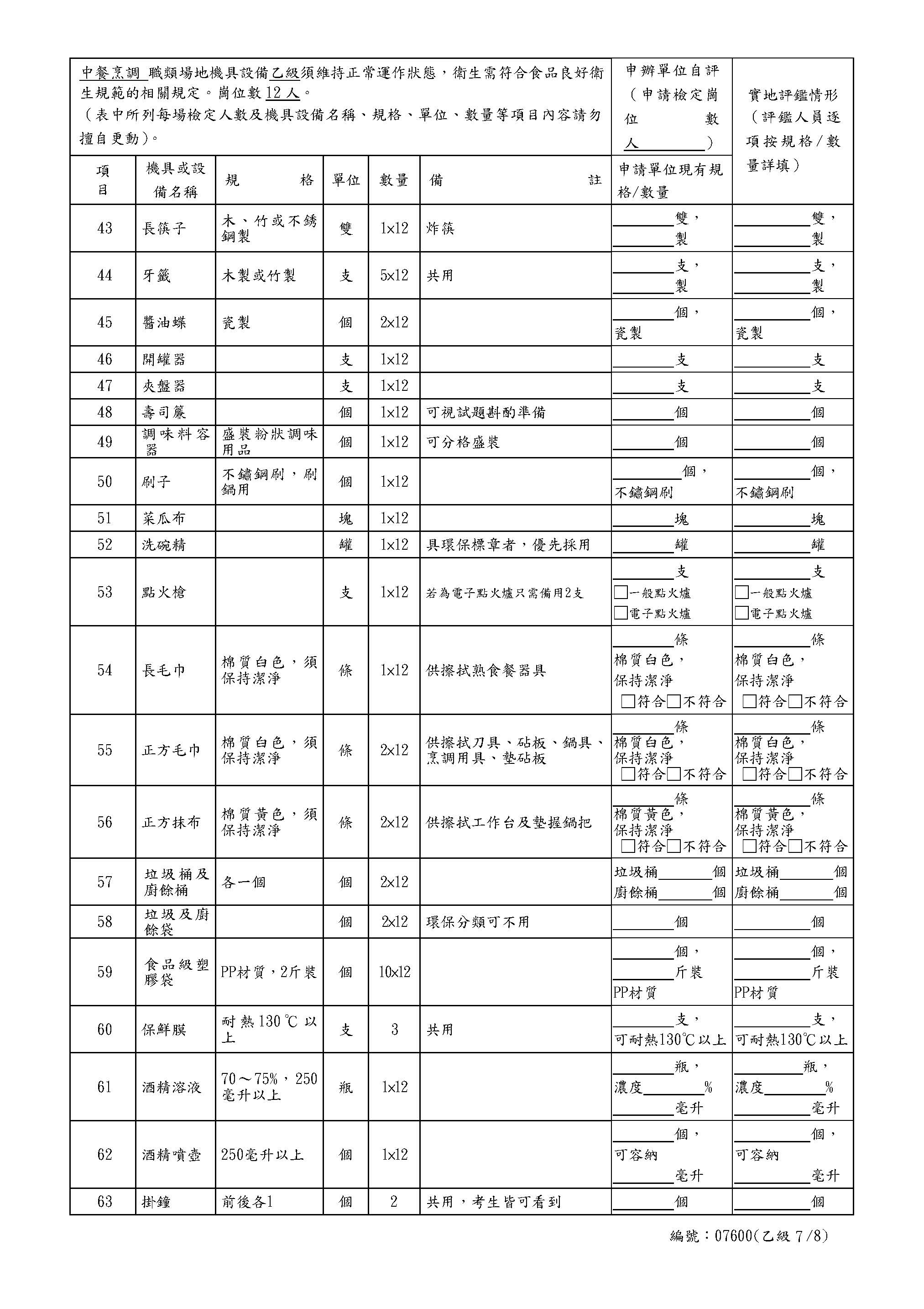 中餐乙級自評表